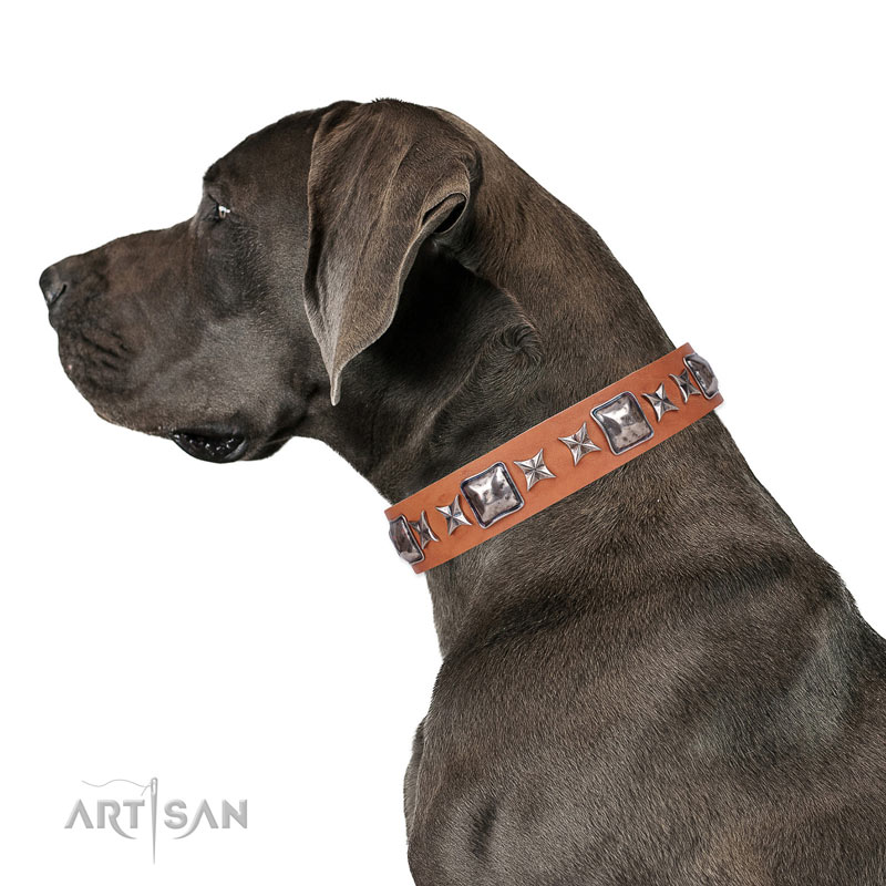 FDT Artisan Distinguished Tan Leather Great Dane Collar with Old-Silver Plated Squares and Stars
